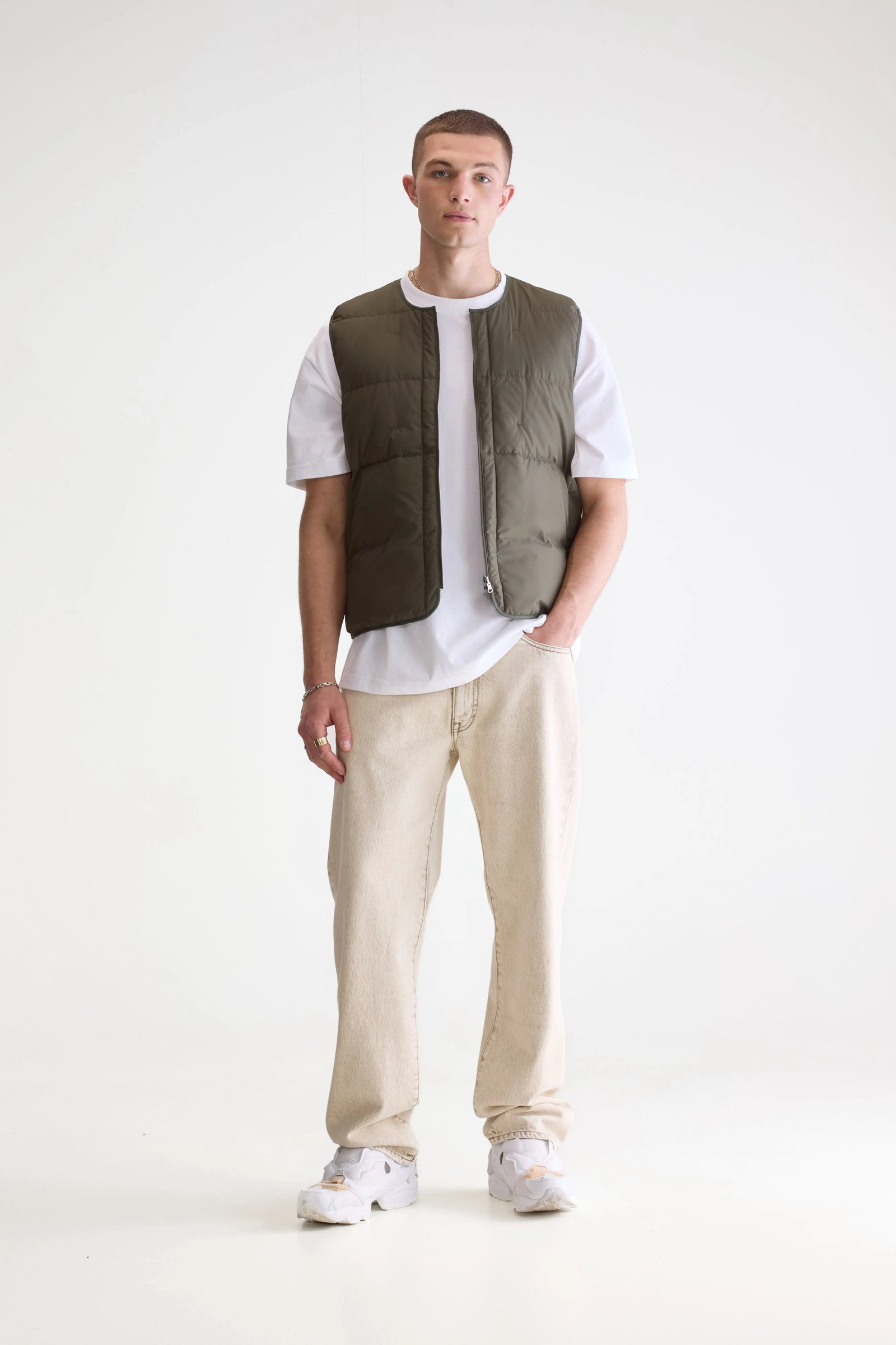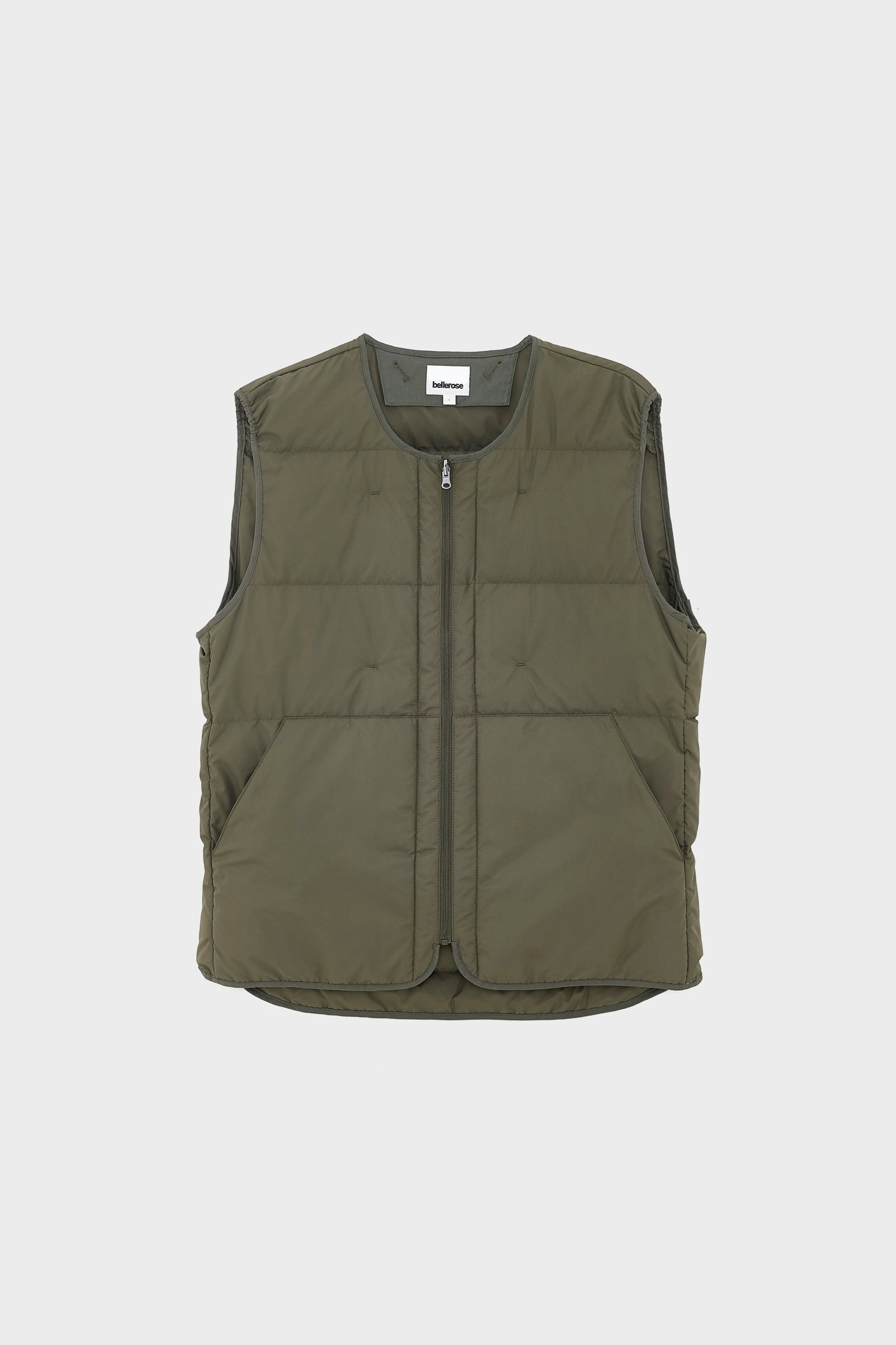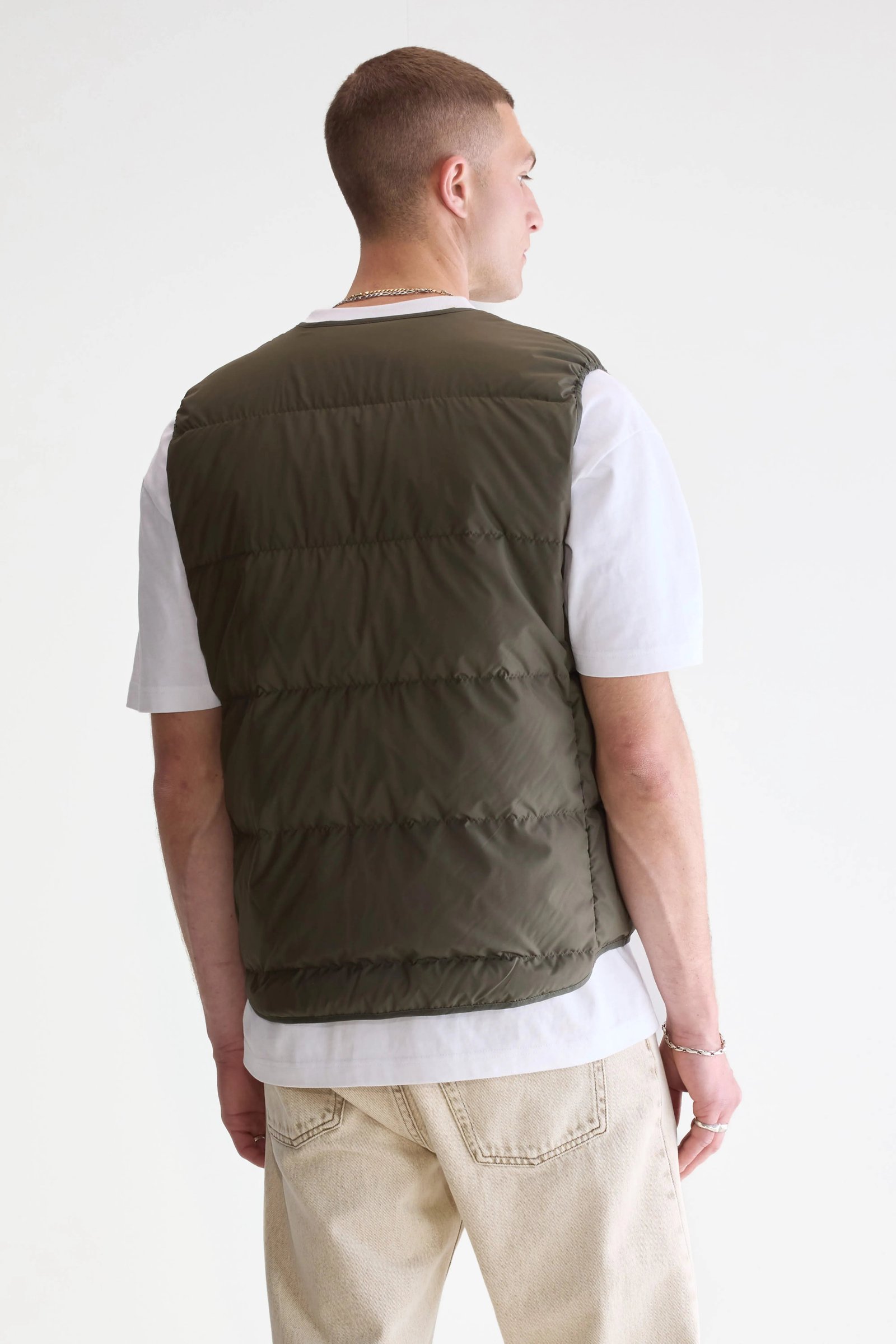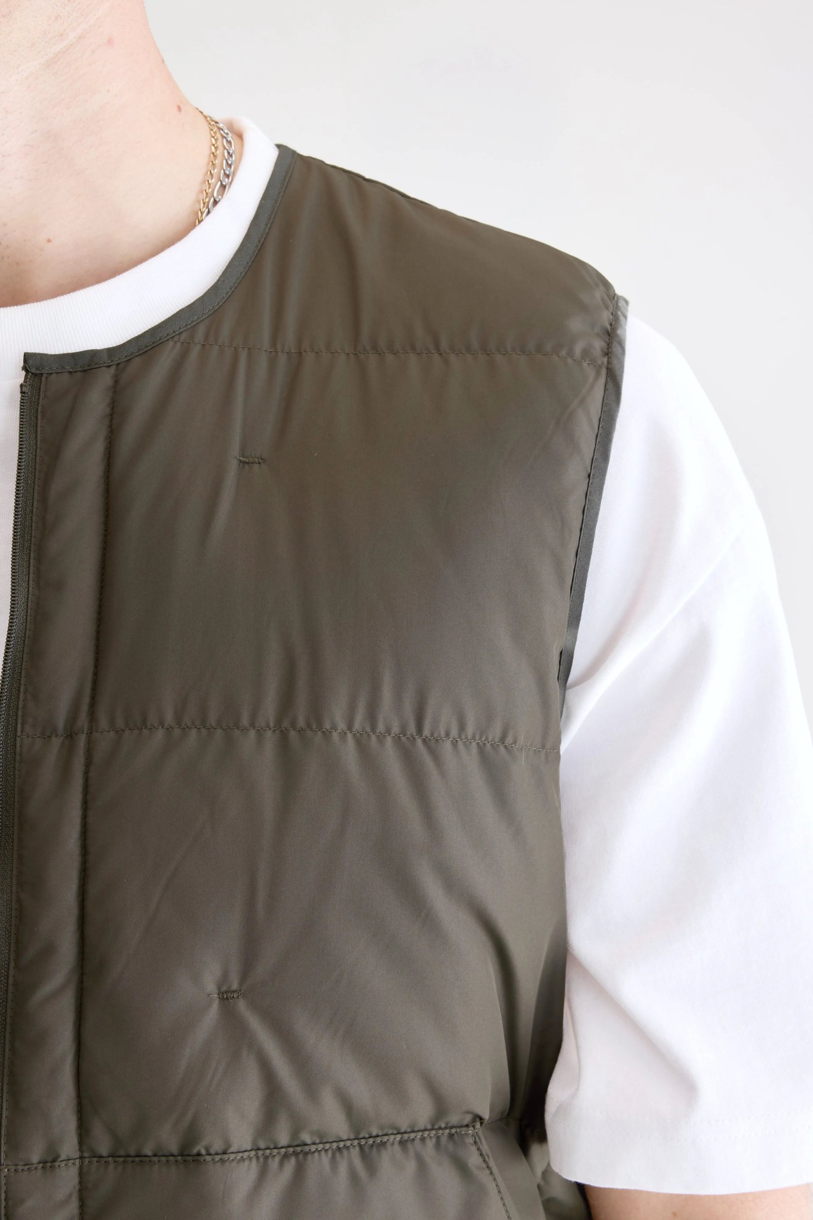 Classic roundneck bodywarmer with zip-front closure in quilted olive green fabric.