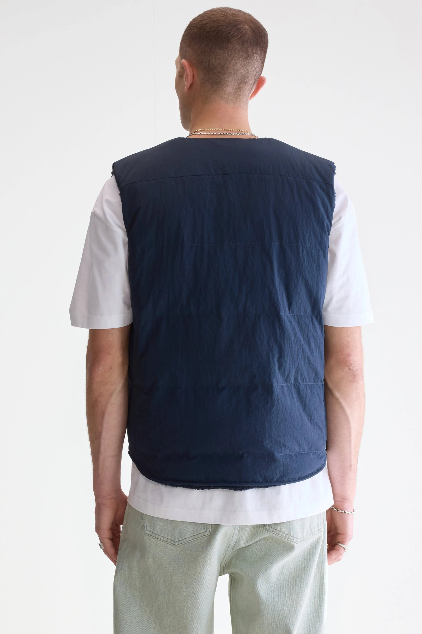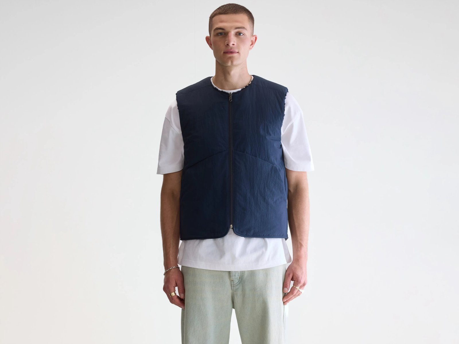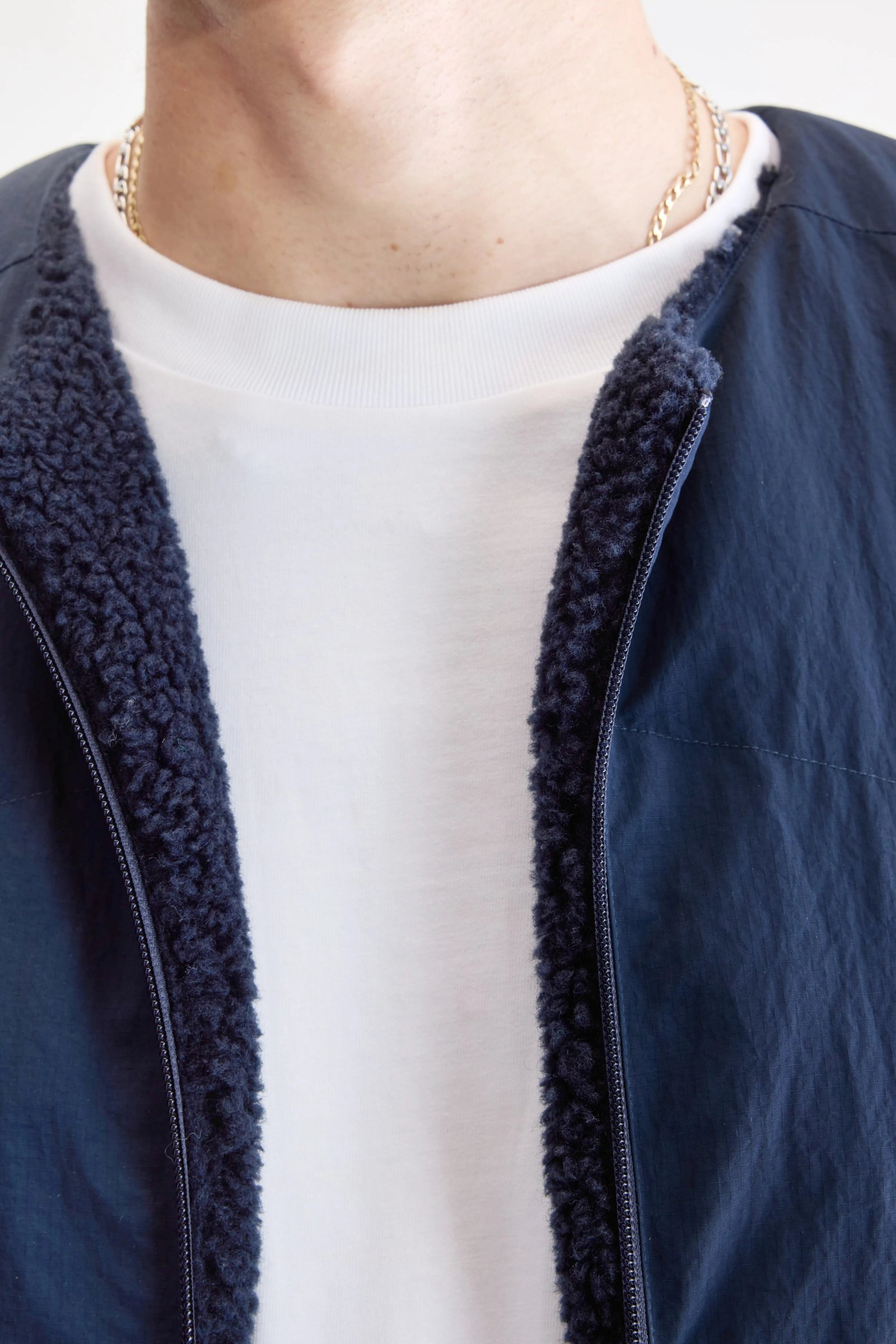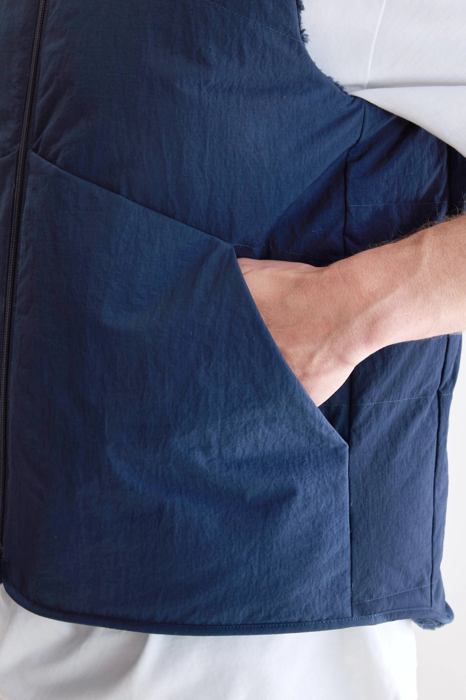 Reversible zip-front body warmer in black-blue ripstop and teddy lining.