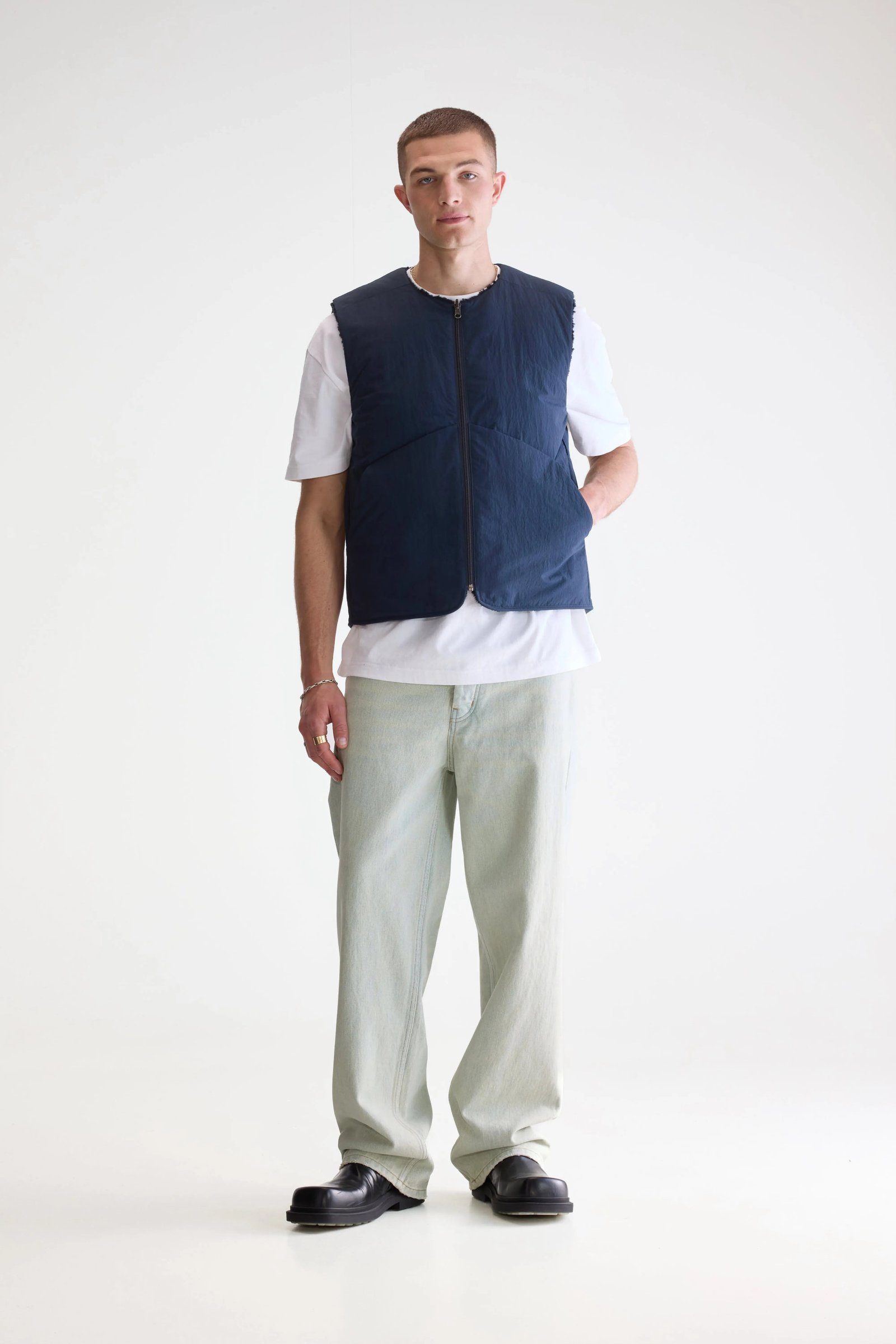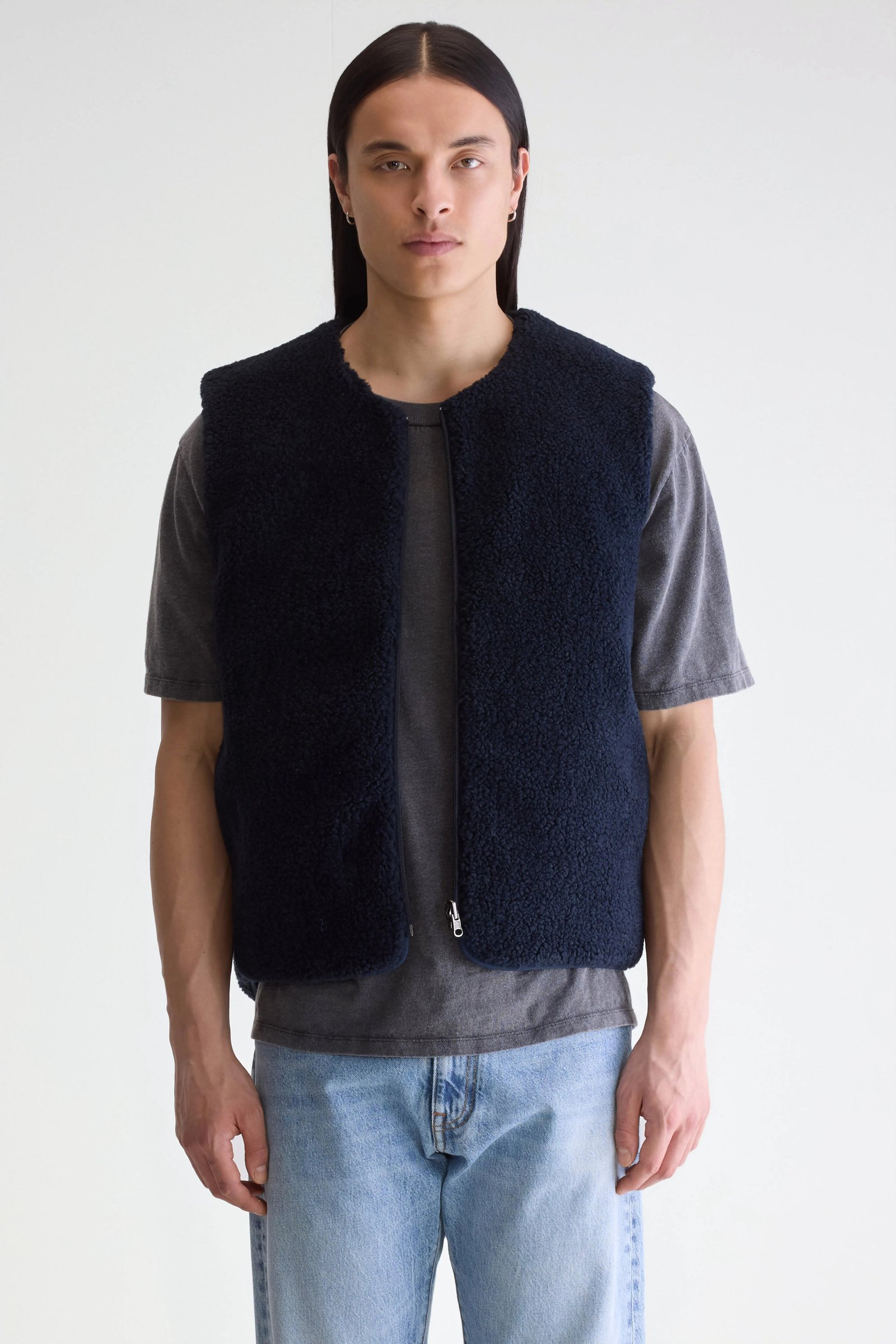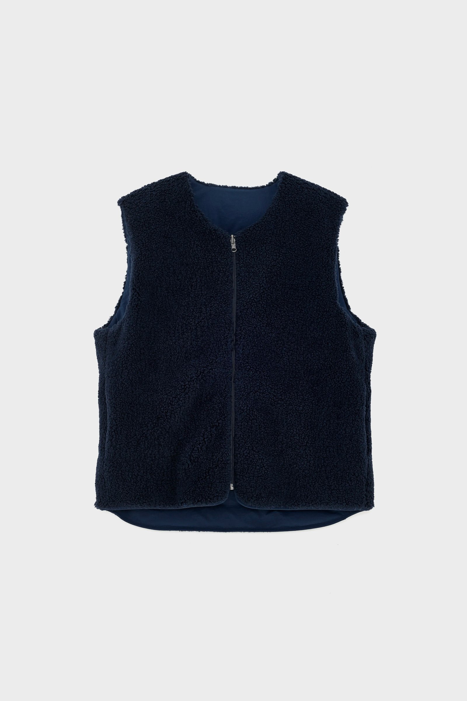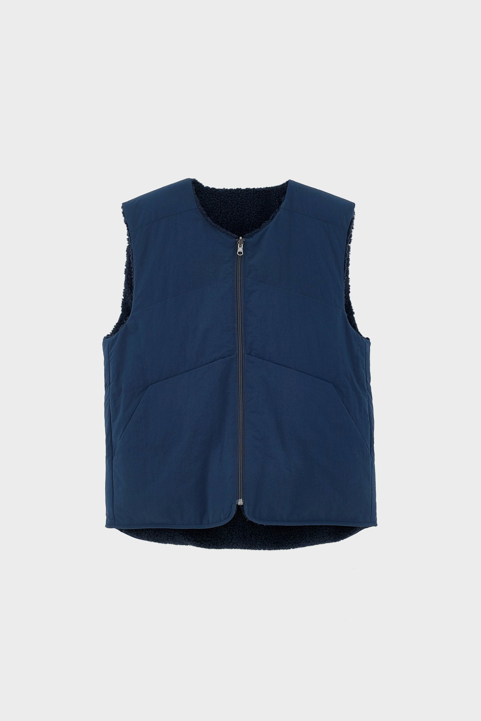 Reversible zip-front body warmer in black-blue ripstop and teddy lining.