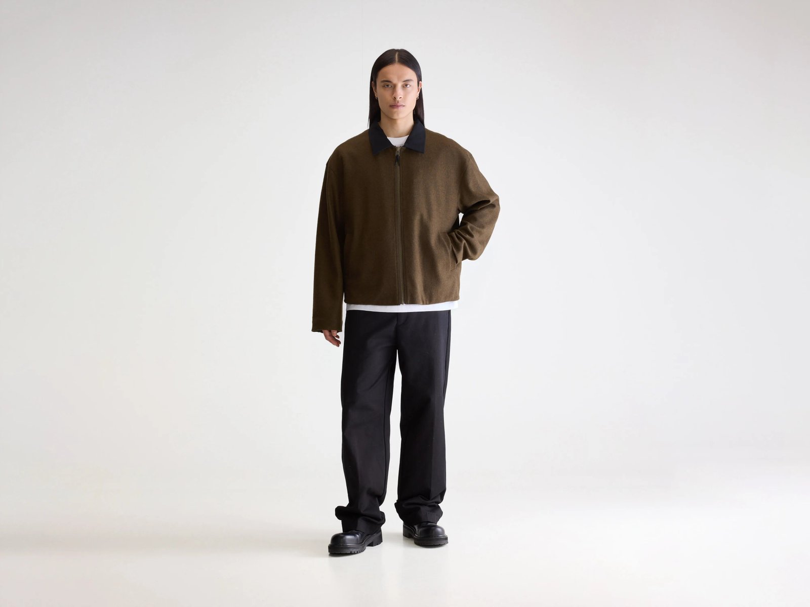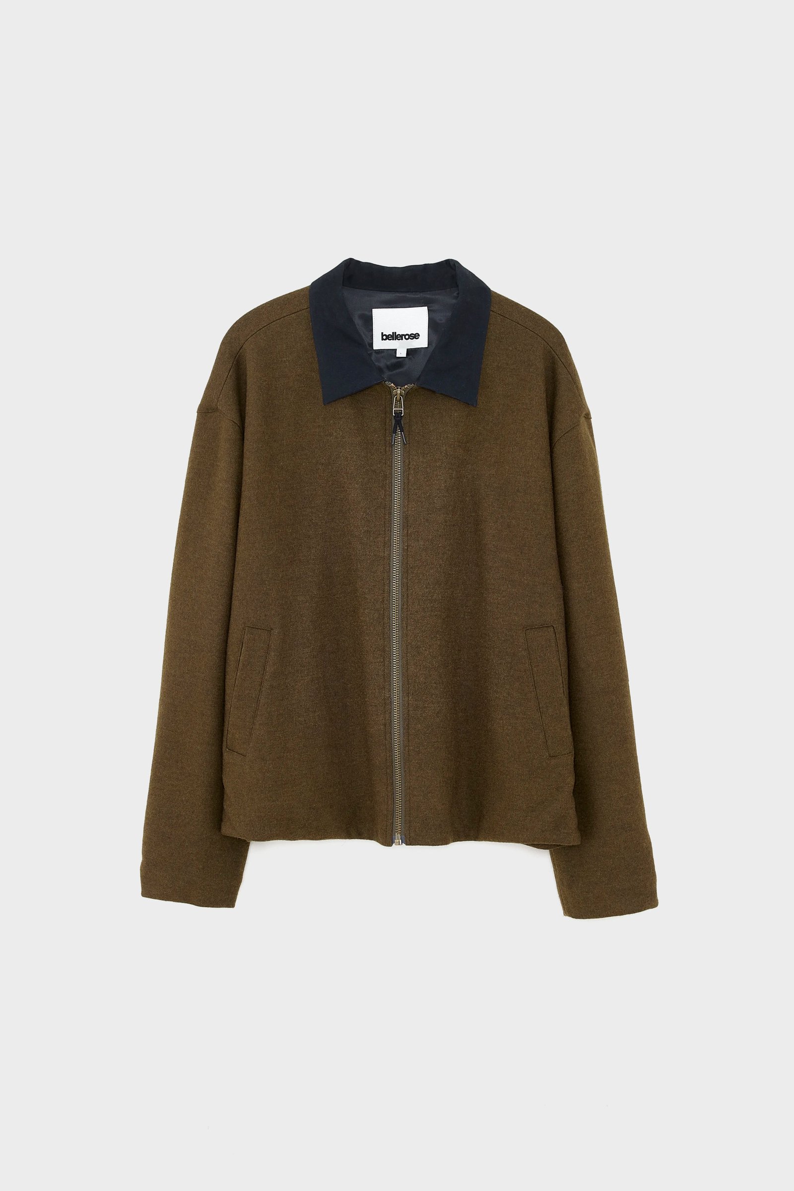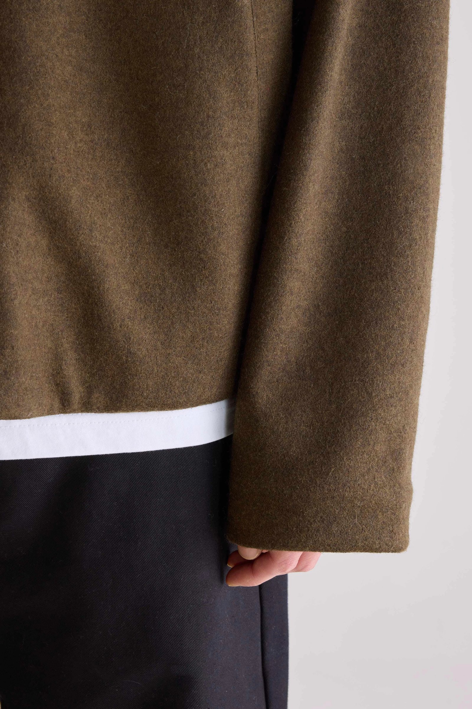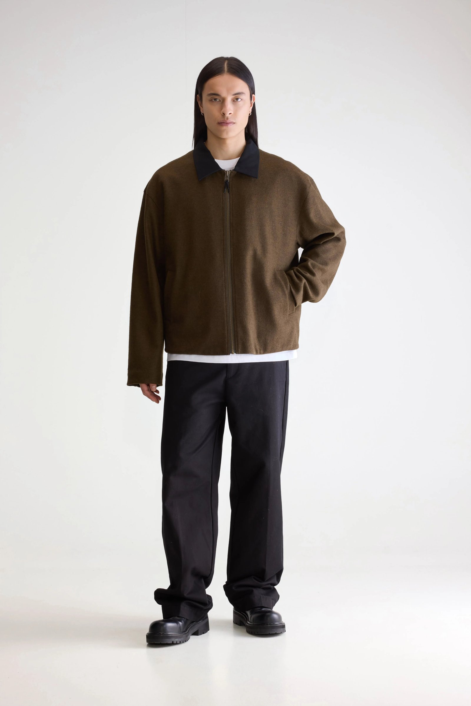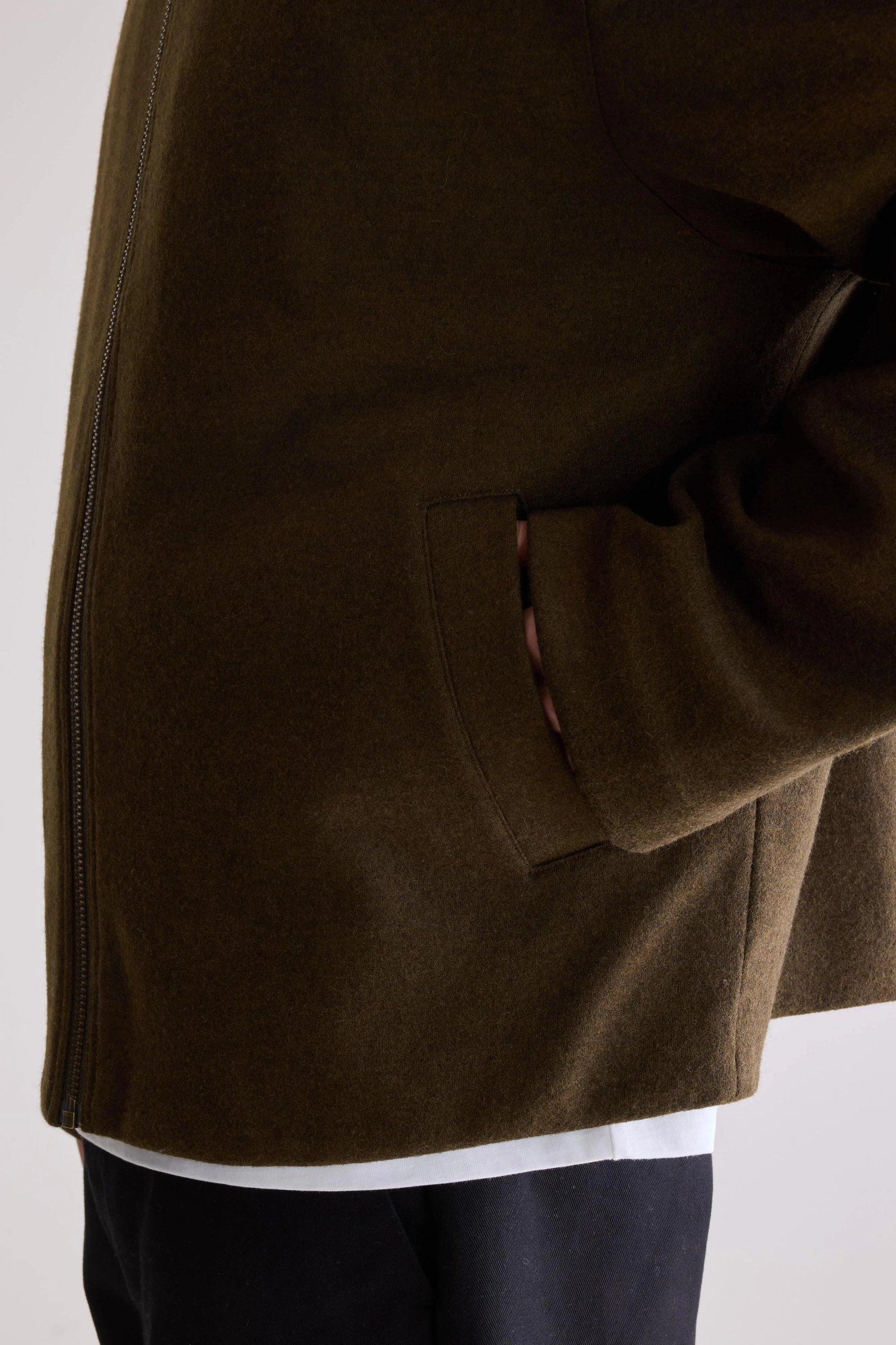 Relaxed zipped jacket with contrasting collar. made from dark olive wool in a structured felted fabric.