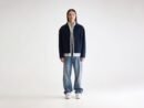 Classic navy wool-blend jacket. featuring a pointed collar. relaxed straight cut fit. and two side pockets for a clean. minimalist look.