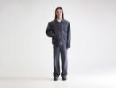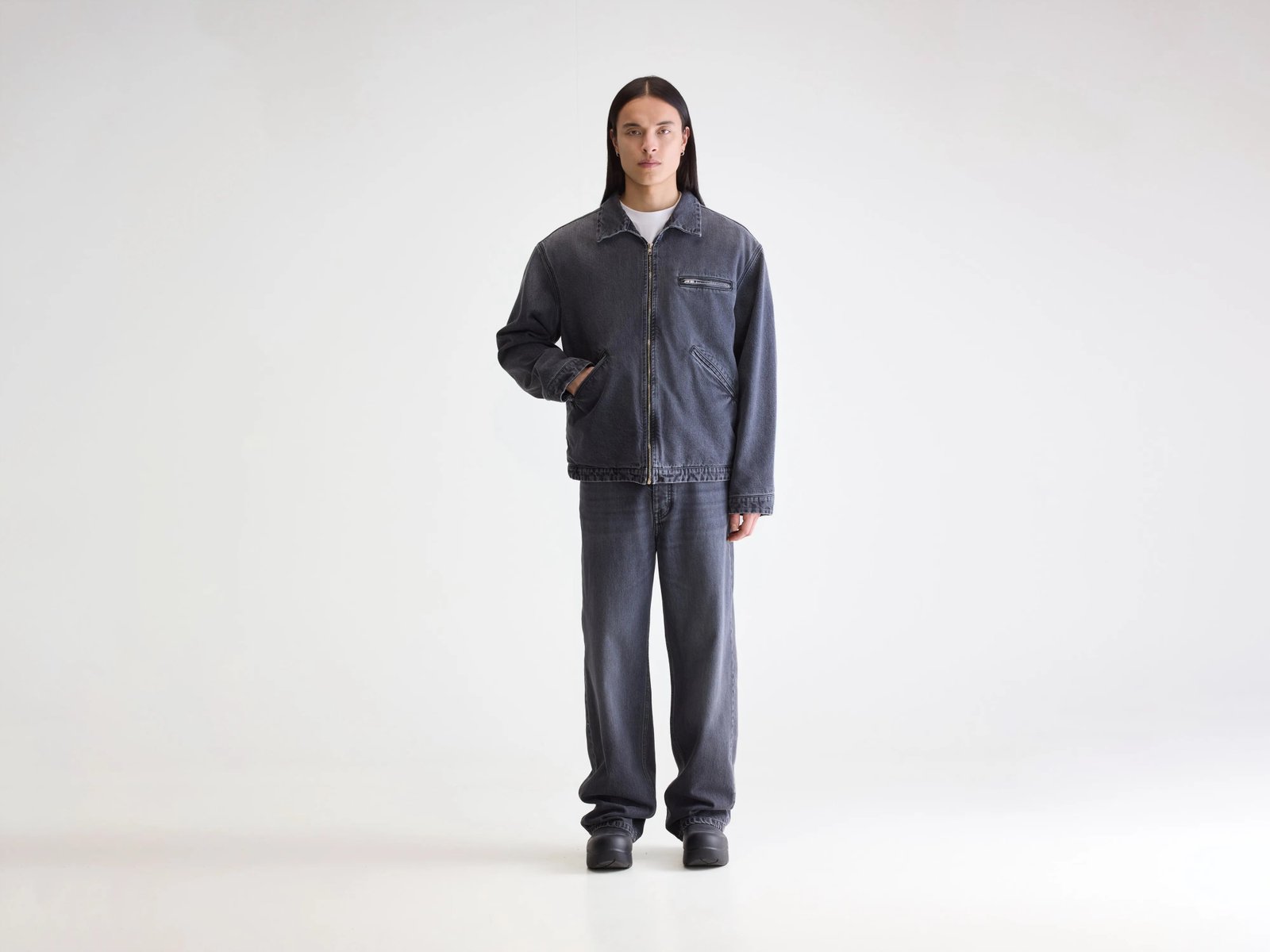 Vintage black denim jacket. with light padding. a classic collar. and a zip-up front closure.