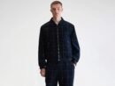 Navy plaid corduroy jacket featuring a classic collar. a zip-up front closure. side pockets. and an elasticated hem for a fitted look.
