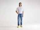 Slim fit. low-rise jeans with straight legs in medium blue wash cotton denim.